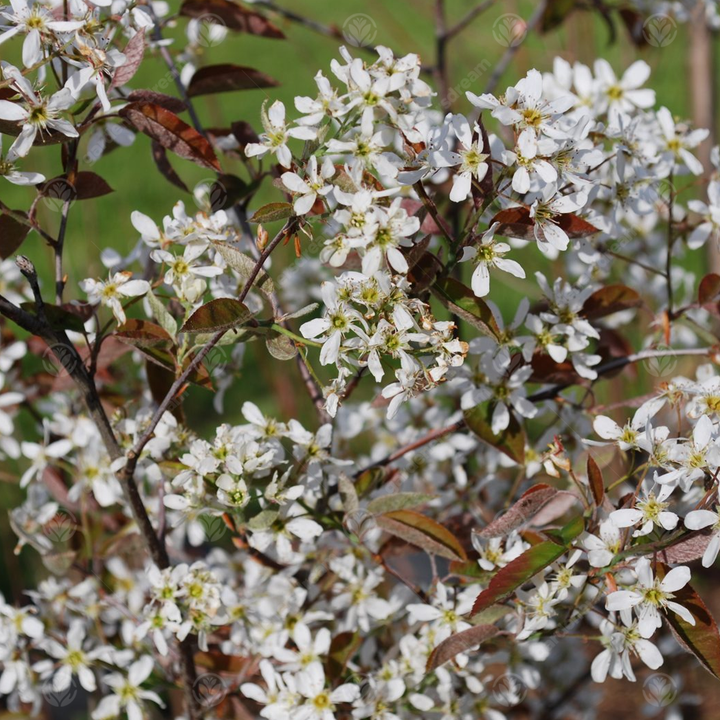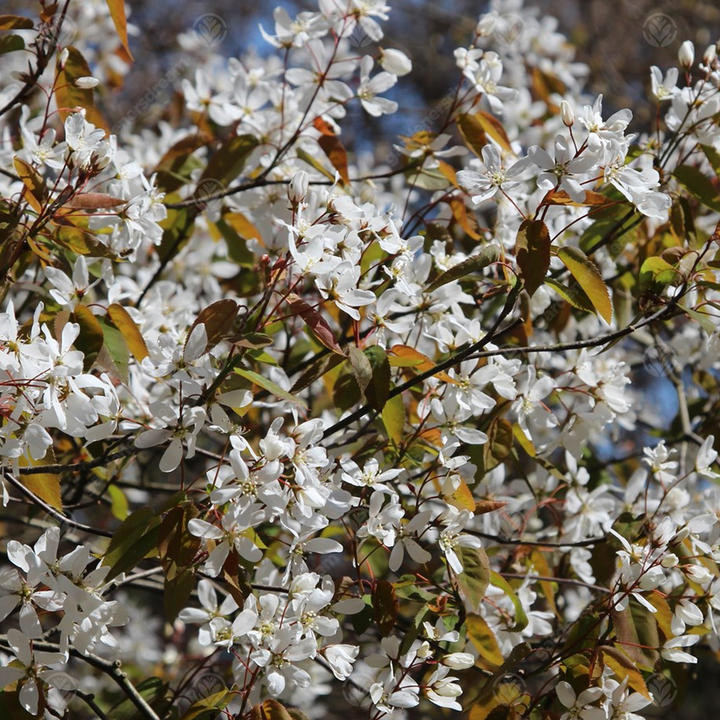 The Amelanchier lamarckii Tree more commonly known as the Snowy Mespilus Tree is a small deciduous tree. This variety has bronze-tinged leaves in Spring before turning red in Autumn. White flowers appear in the Spring followed by dark red berries.