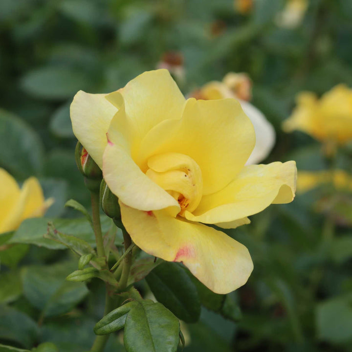 - A vibrant, lightly scented floribunda rose with clusters of warm yellow, cup shaped flowers with golden stamens and glossy, light green foliage