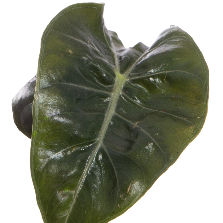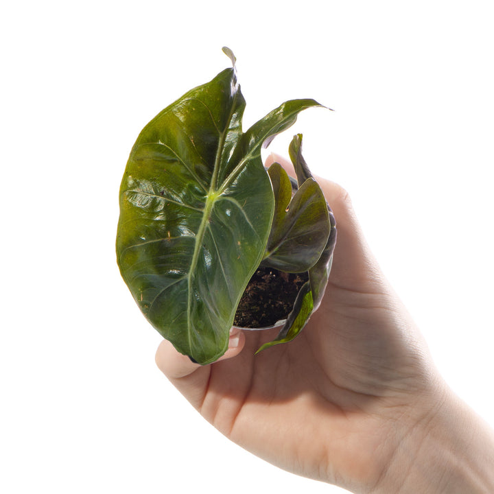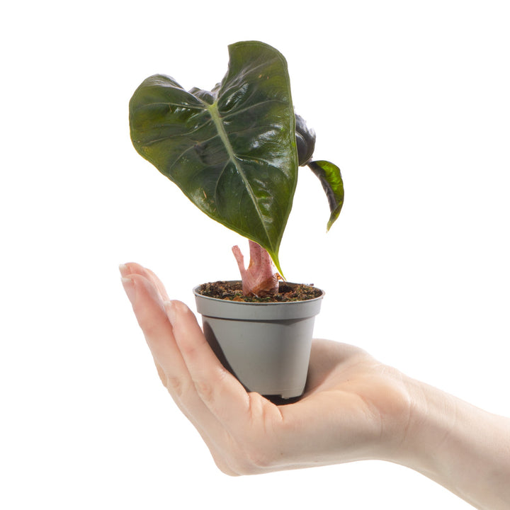 Alocasia Pink Dragon is a small houseplant with uniquely textured leaves. Pink stems fade to a deeper green in the centre of tough leaves, hardened on the top, reminiscent of dragon scales. It may be a baby plant, but its appearance certainly is eye-catching!