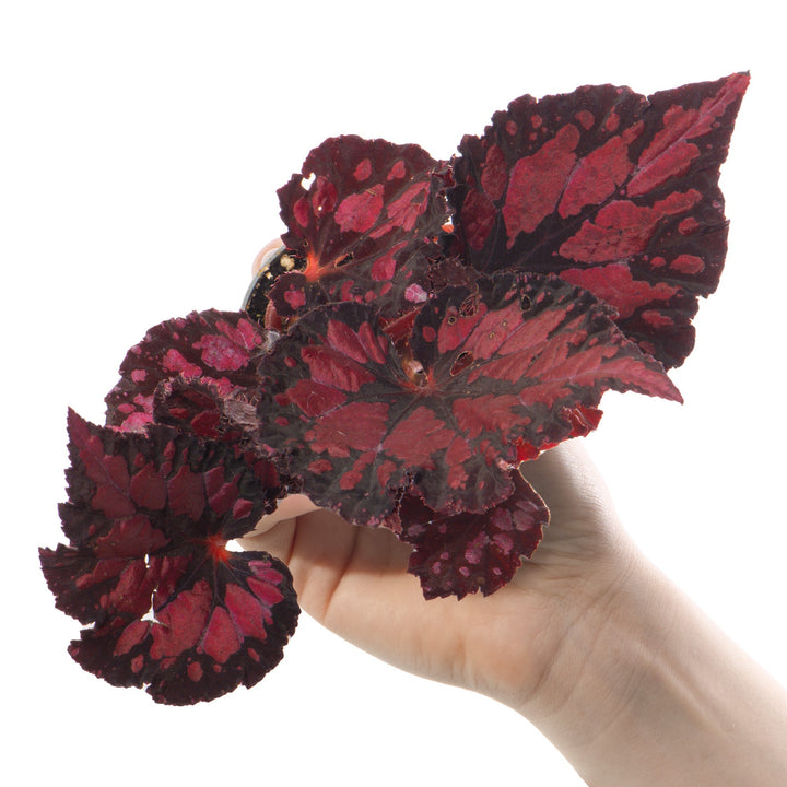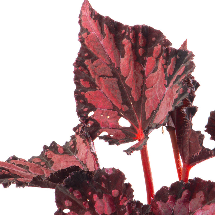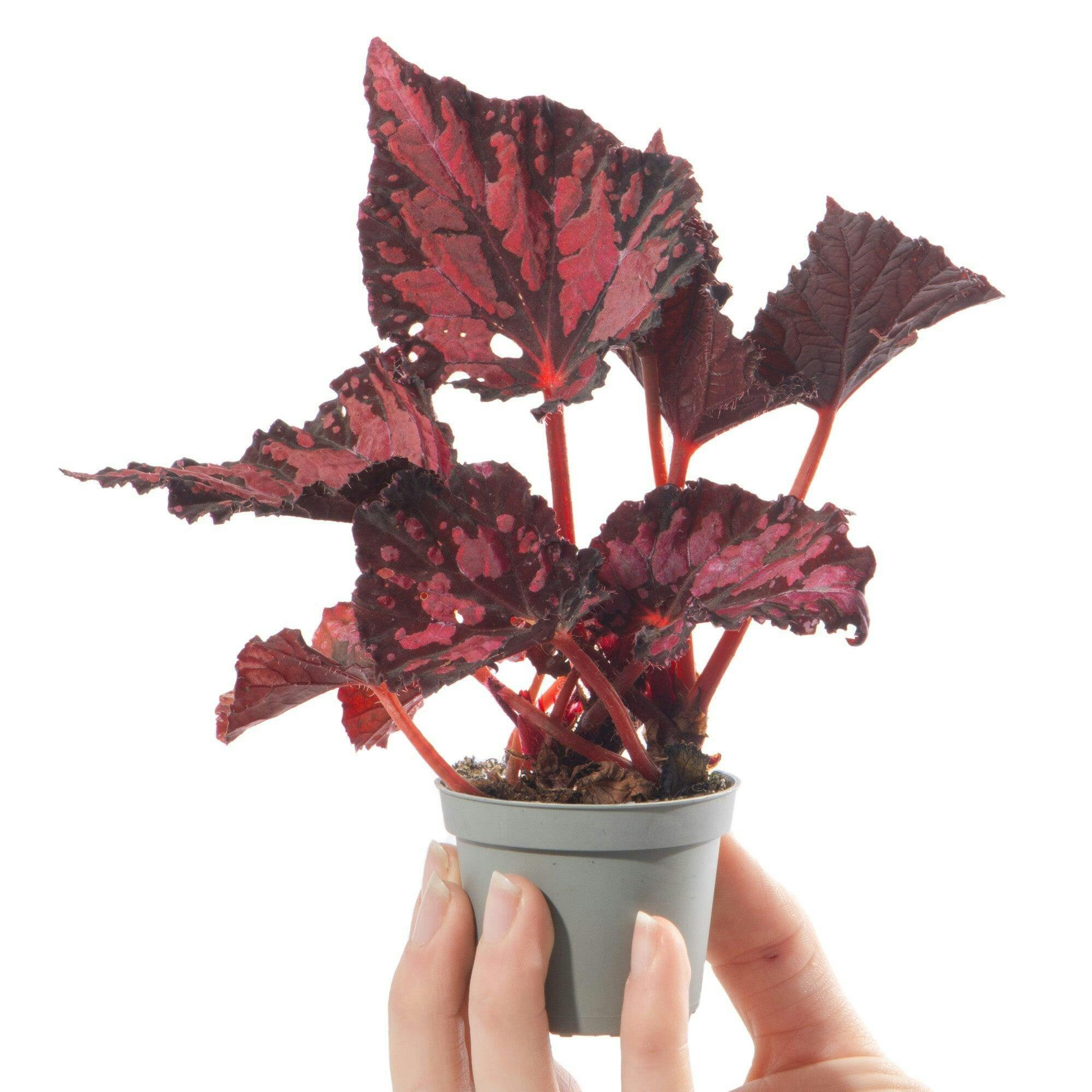 Baby Begonia Pink Pop is a small but eye-catching houseplant with distinct, patterned foliage. The leaves feature shades of deep red and maroon throughout each leaf, making them the main focus of the plant.