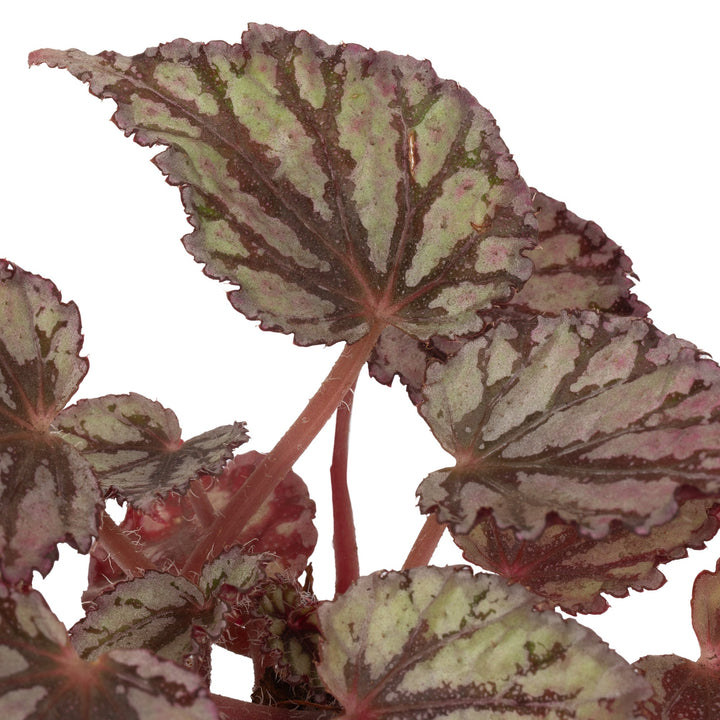 Begonia Rex Dew Drop is a small, bushy, evergreen houseplant with uniquely textured foliage. Pewter leaves with a slight pink hue give off a metallic sheen, laced with deep, black veining. The undersides are a beautiful crimson colour, adding to the plants highly ornamental features.