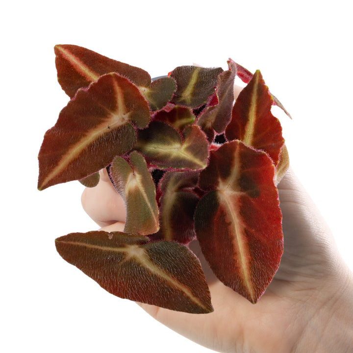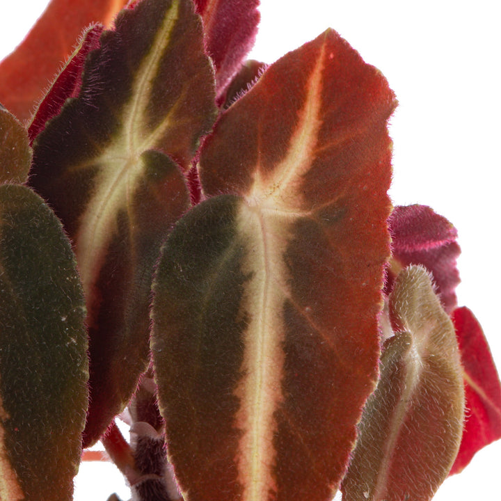 Begonia Rex Listada is a small, bushy houseplant with strikingly colourful foliage. Elongated, oval shaped, darkest green leaves are striped down the middle with eye-catching bright green. These beautiful leaves are also covered in small hairs, making them velvet to touch.
