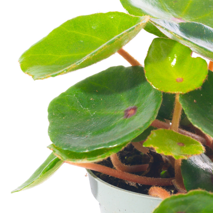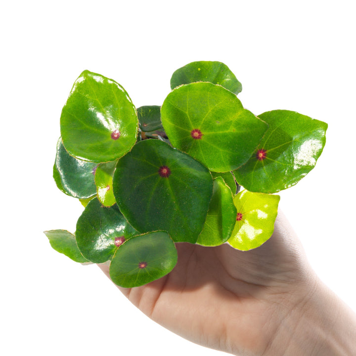 Baby Begonia Rex Red Ruby is a unique begonia, which has a similar appearance to the Chinese Money Plant. Round, flat green leaves each have a red eye in the centre, adding a subtle but striking hint of colour, like a tiny ruby sitting on the leaf.