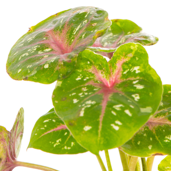 Caladium Casey is a small houseplant with heart shaped leaves which will add a splash of colour to any room. Its leaves have vivid green edges and bright, reddish pink centres, fading out to a paler pink. They are also peppered all over with small white spots.