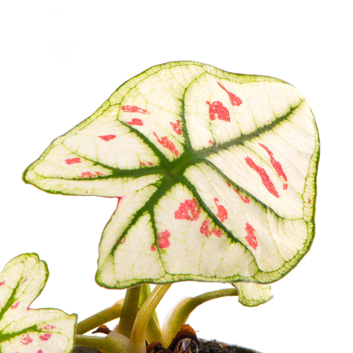 Caladium Kelly is a small houseplant with unique, pale coloured leaves which will attract attention in any room. Its pale cream, almost white leaves are edged with green, marked with green central veining, and spotted all over with pale pink.