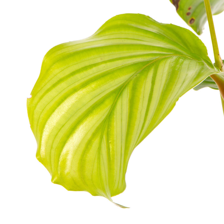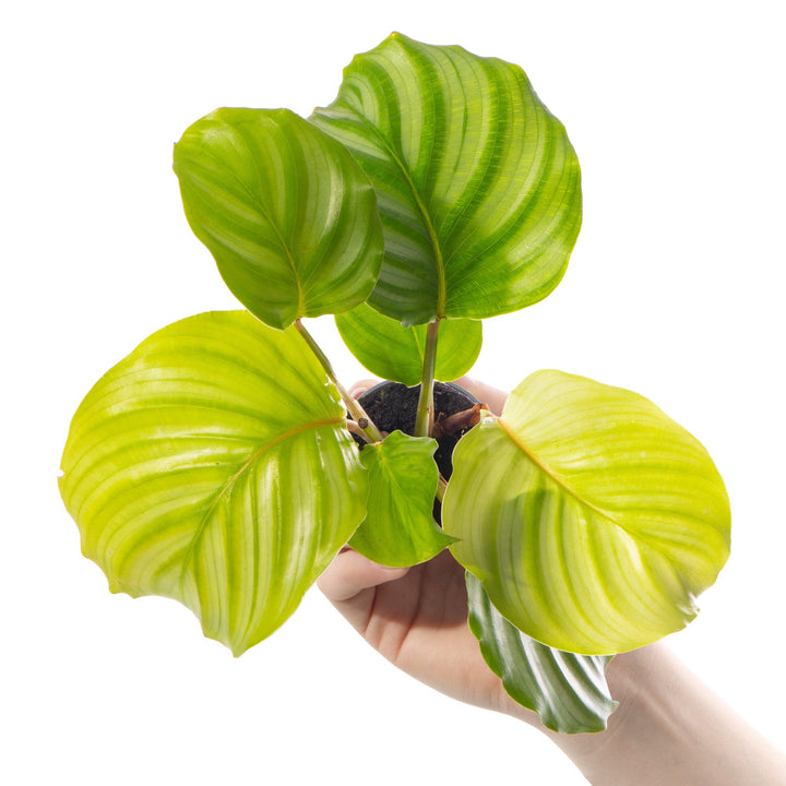 Calathea Orbifolia, or round-leaved calathea, is a wonderful little houseplant with distinct, large green leaves, striped with pretty white bands spreading outwards from their middles. This tropical beauty will thrive in a well-draining soil, avoiding waterlogging or overt dryness, in a space with a moderate amount of light and high humidity.