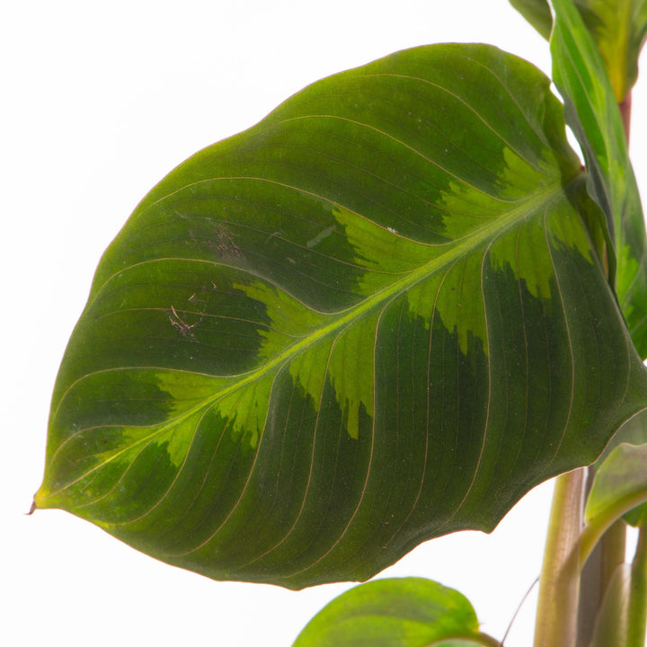 Calathea Warscewiczii is a luxuriously exotic plant that is part of the Prayer Plant family - you’ll notice its leaves folding up at night and opening again in the morning, like two hands in prayer. Its rich green leaves are decorated with lighter green stripes on top and deep purple undersides. The foliage has a soft velvety feel, which is why Calathea Warscewiczii is also known as the Jungle Velvet plant.