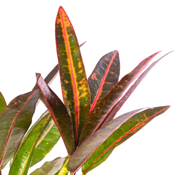 Codiaeum is often referred to as ‘Joseph’s Coat’ because of the array of rich, vibrant colours it comes in. This variety features mid green leaves with a veined pattern in bright yellow. The underside of the foliage pop with deep read hues that give the plant a beautiful autumnal look.
