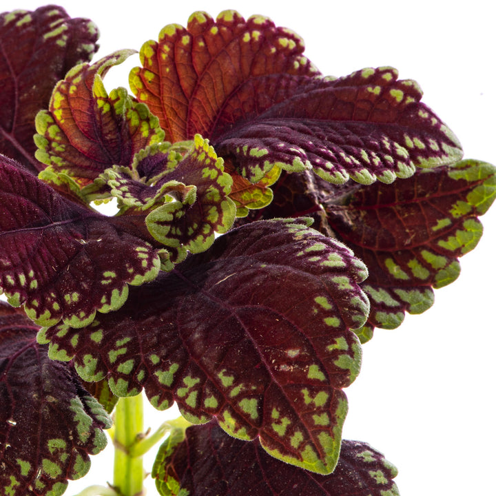 Coleus Main Street Abbey Road is the perfect example, boasting bright green leaves with deep burgundy accents. The ovate serrated leaves have patterns etched over them in gorgeous jewel coloured hues, creating a luxurious feel that will suit any room.