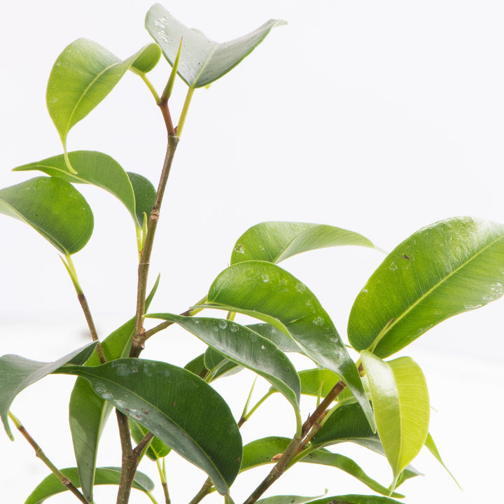 Baby Ficus Benjamina Natasja is a small houseplant with fresh, dark green leaves growing along slender, arching branches. It is a beautifully simple plant, perfect for adding a touch of foliage or leafy texture to your houseplant collection in and around your home.