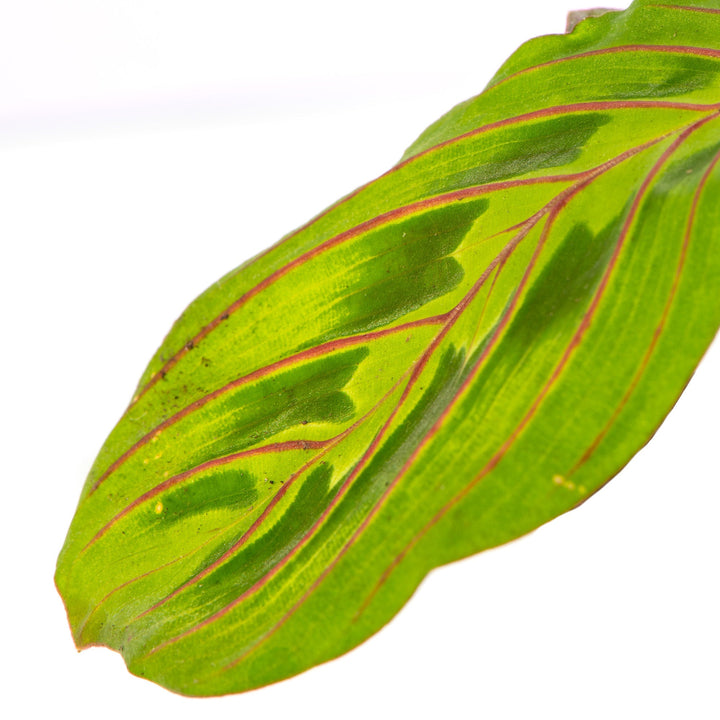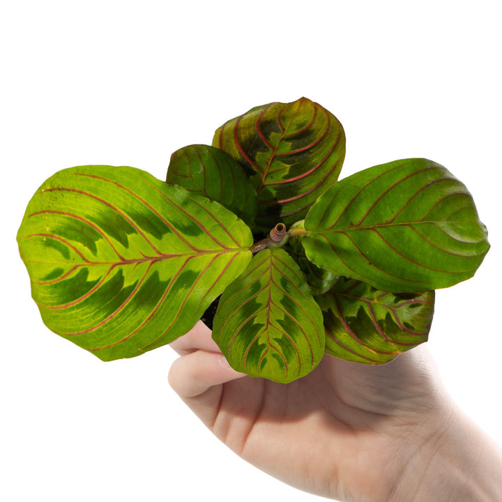 Maranta Leuconeura Red Stripe is a baby houseplant with stunning, showy foliage. Oval-shaped, dark green leaves are patterned with bright green, giving the appearance of feathery brush strokes. Striking, crimson red veins also appear in a uniform pattern, making this plant a real showstopper despite its miniature size!