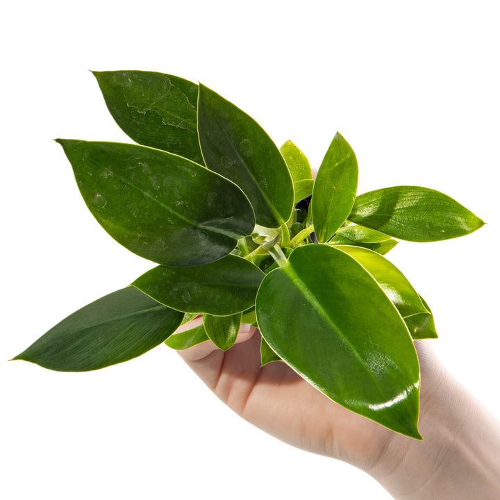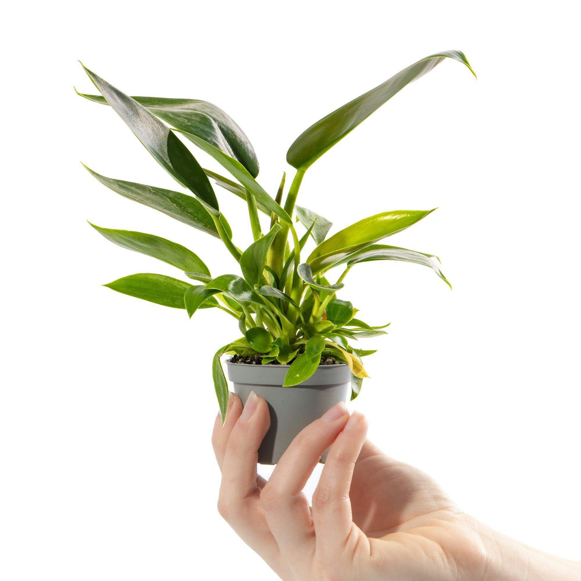 Philodendron Golden Princess is an indoor plant with lush, dark green leaves and sturdy stems. Each leaf will grow in a vertical manner before drooping at their peak, emphasising their large size, despite being a small baby plant!