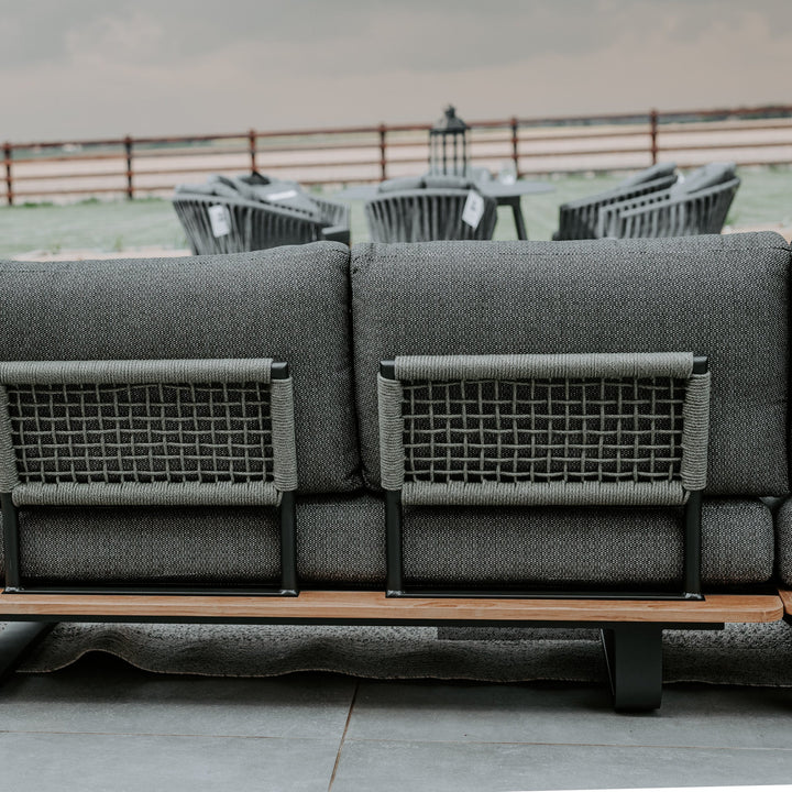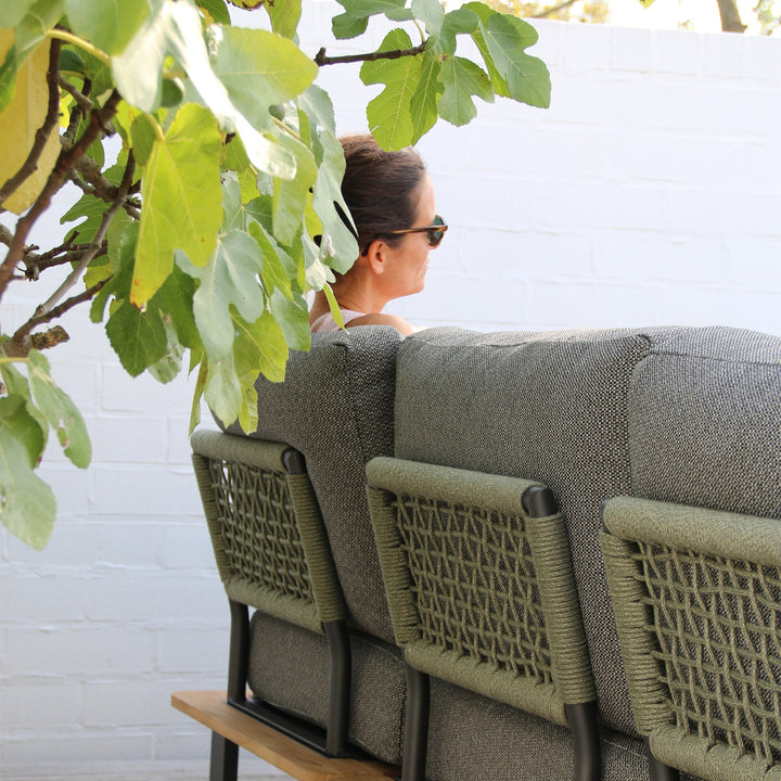 Our modern Bay Corner Sofa Group is a combination of both sophistication and style. This group not only exudes luxury, but also is crafted with comfort in mind and sturdy in nature. This Bay Corner Group Set distinctively features a robust powder coated aluminium frame woven with Olive Green acrylic rope to not only protect against the elements, but to be eye-catching and contrast beautifully with the vibrant teak table.