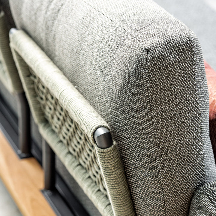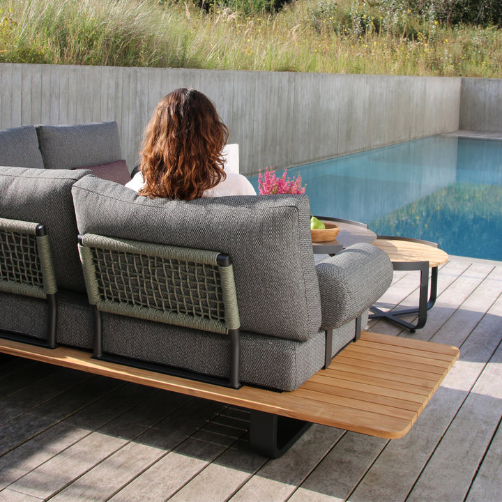 Our modern Bay Corner Sofa Group is a combination of both sophistication and style. This group not only exudes luxury, but also is crafted with comfort in mind and sturdy in nature. This Bay Large Corner Group Set distinctively features a robust powder coated aluminium frame woven with Olive Green acrylic rope to not only protect against the elements, but to be eye-catching and contrast beautifully with the vibrant teak table.