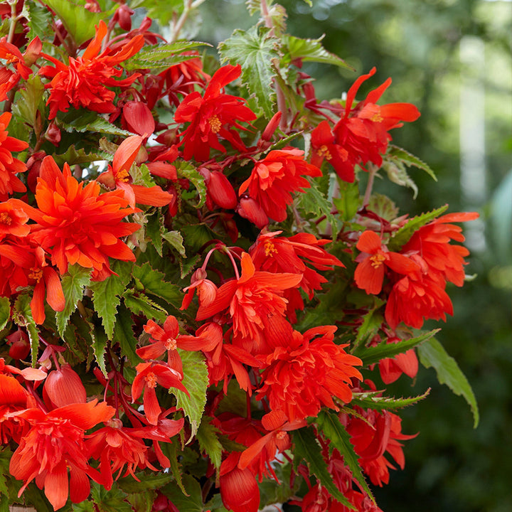 Begonia Orange Cascade is a vibrant tuberous perennial renowned for its abundant double orange flowers that bloom profusely from June until October. These eye-catching blooms create a striking display in hanging baskets and containers, adding a bold splash of color to any garden setting.