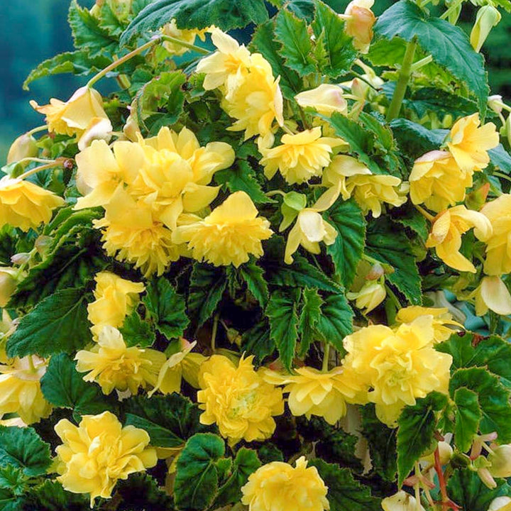 Begonia Cascade Yellow is a tuberous perennial renowned for its trailing habit and vibrant double yellow flowers. Throughout the summer and autumn months, it produces abundant blooms that cascade gracefully, making it an excellent choice for hanging baskets and containers. The lush green foliage complements the bright flowers, adding a touch of elegance to any garden setting.