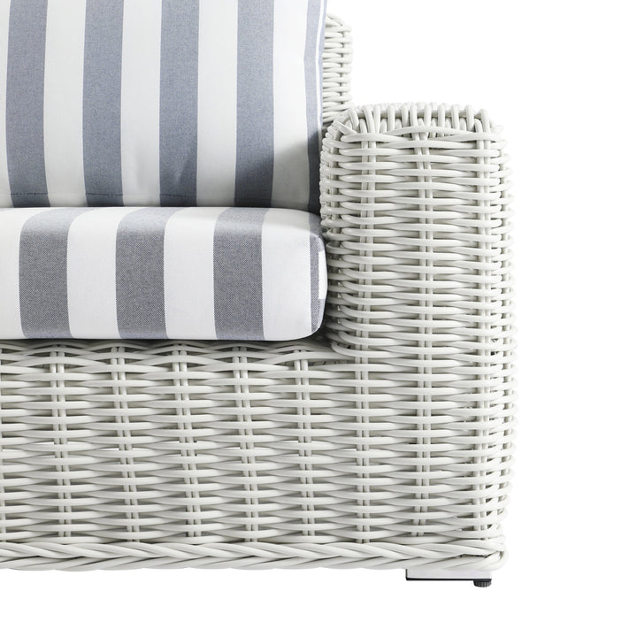 - Blue striped weatherproof fabric upholstered back and seat cushions perfectly coordinate with white wicker rattan, bringing coastal breeze to your outdoor space