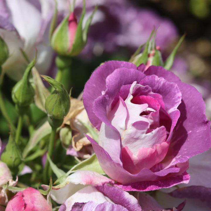 - An almost thornless floribunda rose with magnificent clusters of strongly scented lilac-blue flowers - easy to manage and very free flowering