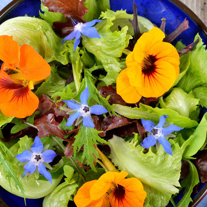 - Borage, or Starflower, is a bright and aromatic herb with edible leaves and blue, star shaped flowers throughout the summer