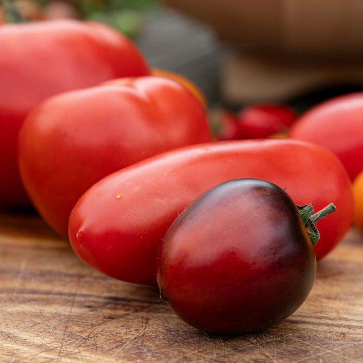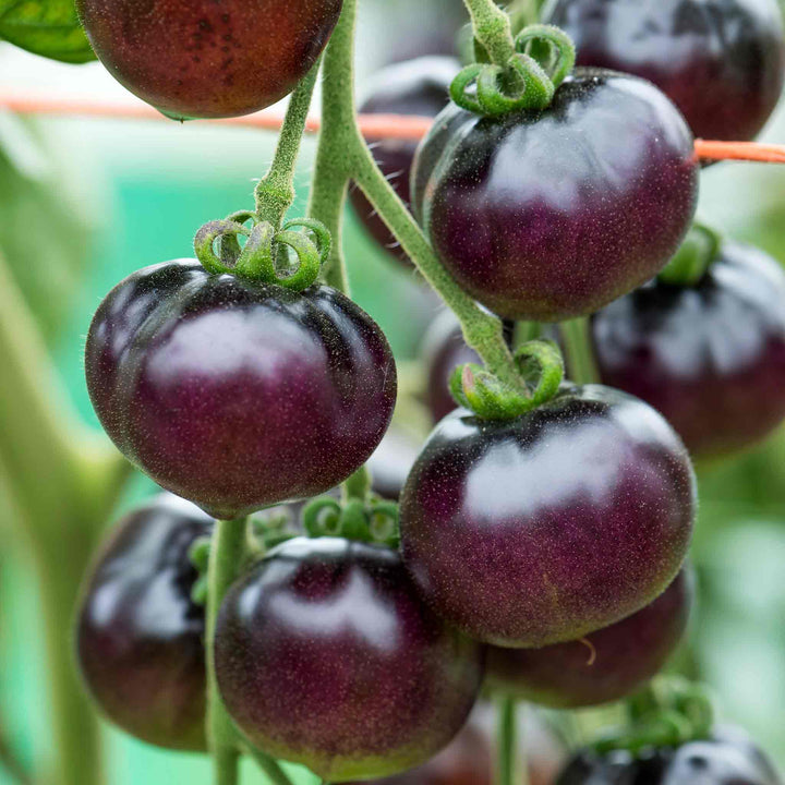 With high levels of anthocyanins, the antioxidants food in purple/red foods like blueberries and pomegranate, these are super healthy tomatoes. A high yielding variety, produces masses of fruits on long trusses. The sun plays a big part in colouring up the skin's and the darkest parts are those most exposed to sunlight. Over the ripening period the skin colour can vary greatly but try to leave fruits on the plant for as long as possible to achieve the greatest flavours and sweetness.