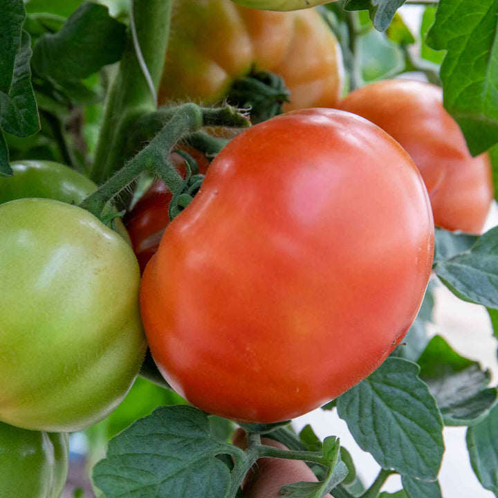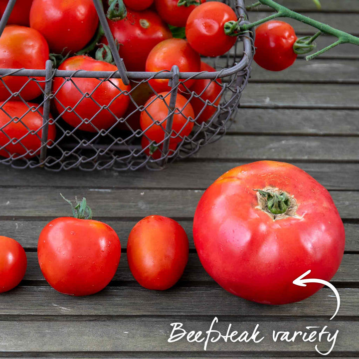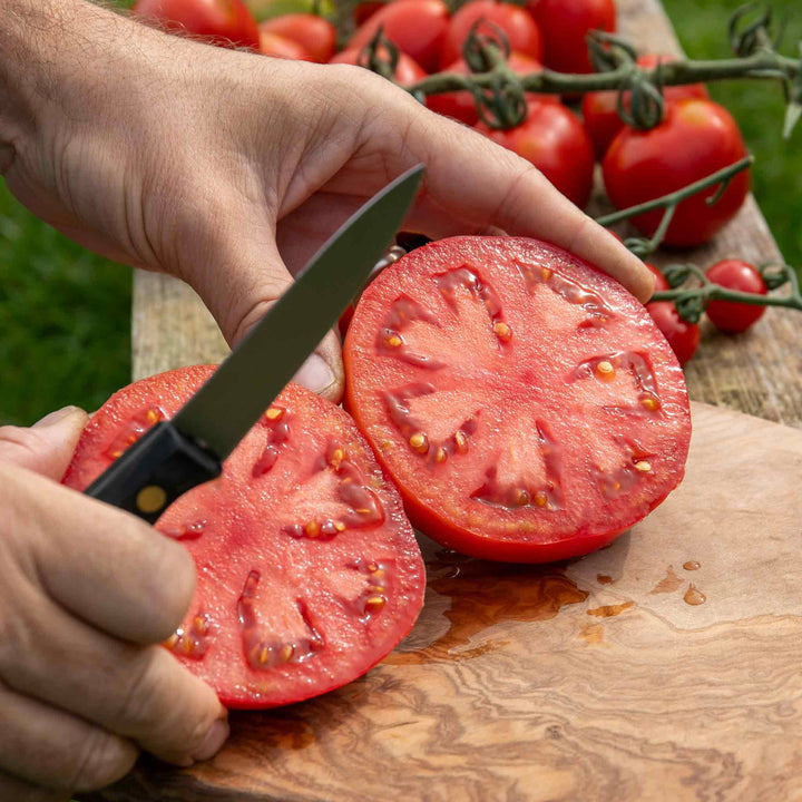 Large and Juicy fruits, with irregular ribs. Good firm flesh and full of flavour. Has a semi-determinate habit, so won't need the side shoots pinching out but may benefit from some support if the plants grows large and especially when the fruits are at their peak.
