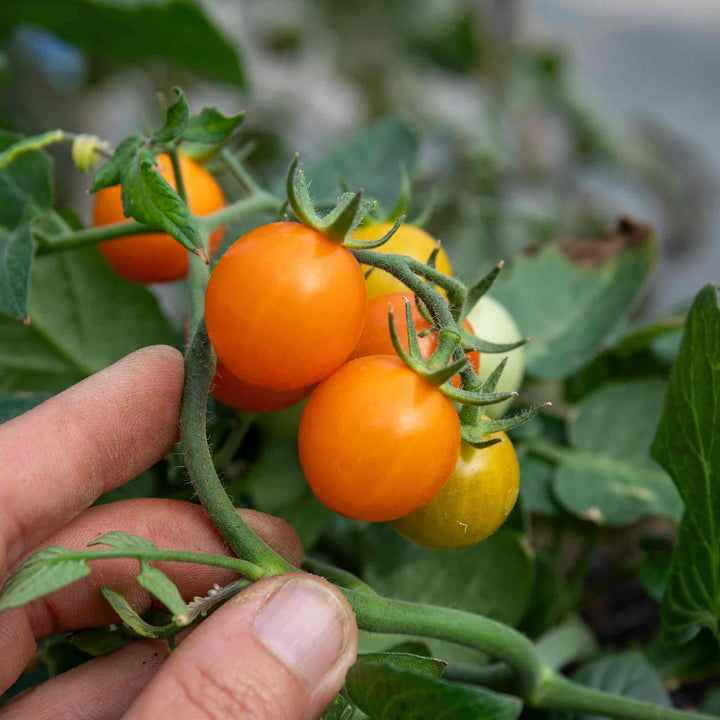 - Masses of orange-skinned cherry tomatoes on arching stems.