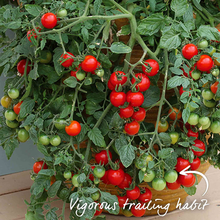 These tomato Tumbling Tom Red plants grow masses of sweet, cherry tomatoes. Perfect for growing in pots, containers and and hanging baskets they are suitable for growing outside on patios and balconies - a great option if you don't have a greenhouse. You'll get a huge amount of fruit throughout the summer. Sturdy self supporting variety.