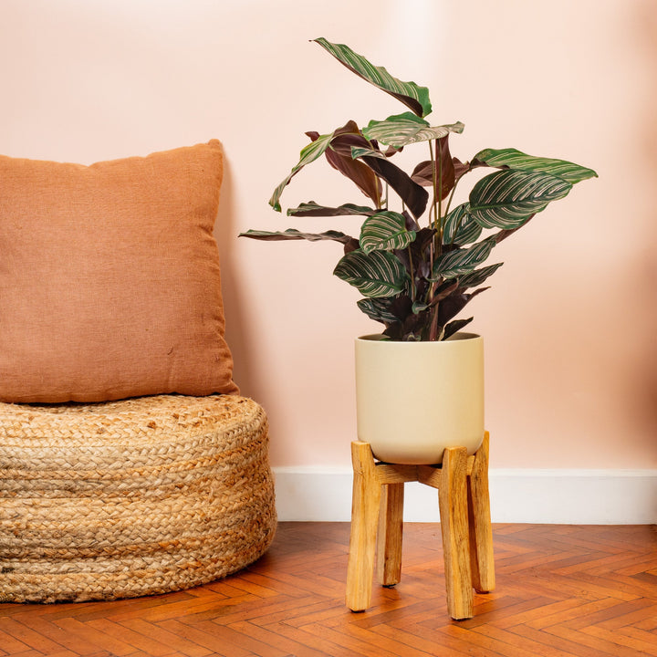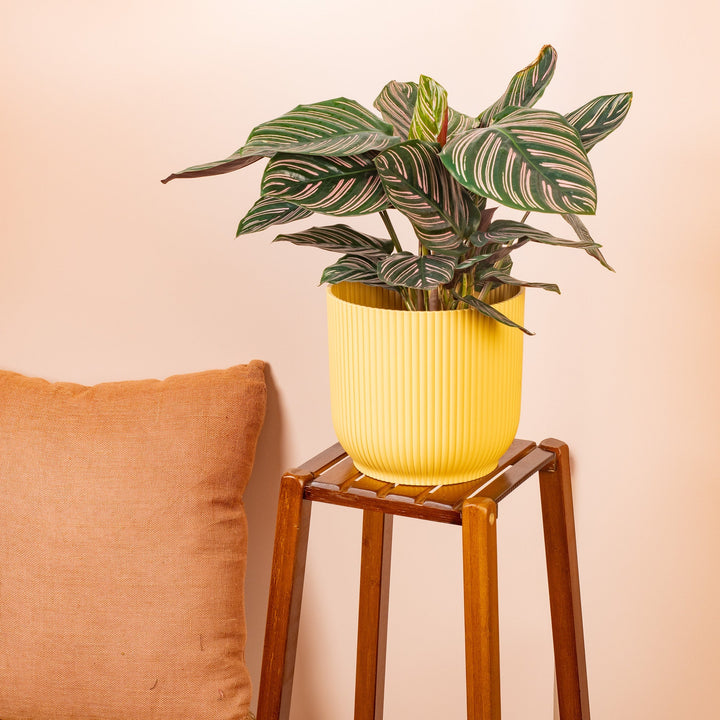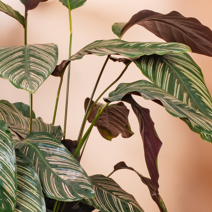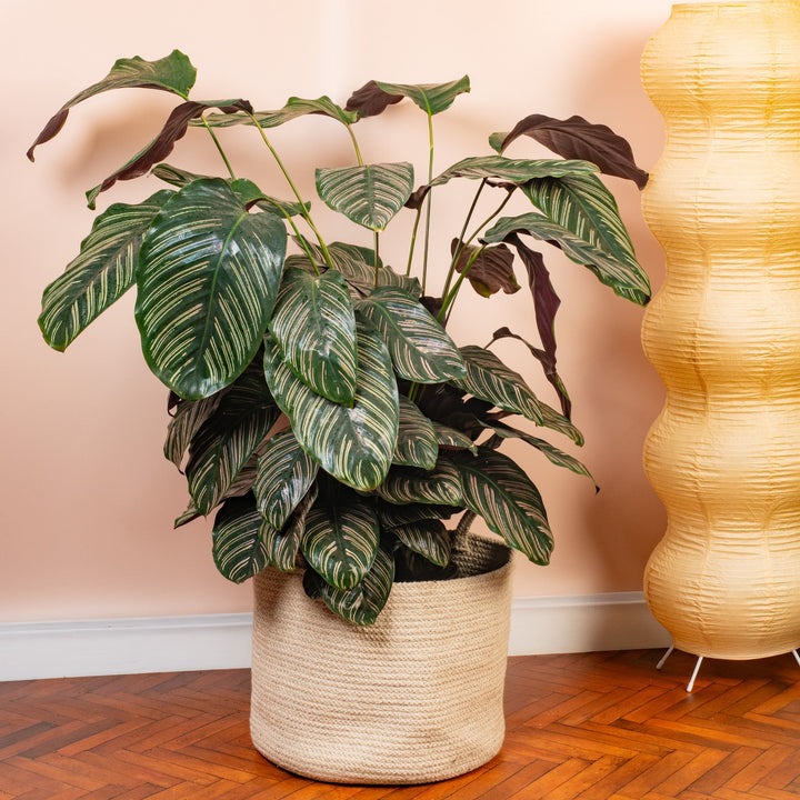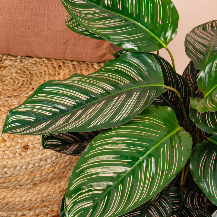 Calathea Ornata is an evergreen plant with unique, distinct features which make it the perfect plant to stand out in any household. It should be located in a well-lit place, without the need for direct sunlight. Ornata is a plant that is a popular member of the Calathea genus, with stunning pinstriped features on the dark green foliage. It also boasts a particularly exclusive reddish-purple underside of the plants leaves, which just adds to this plant’s gorgeous appeal.