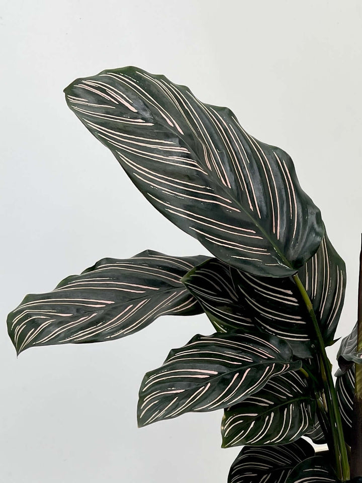 Calathea Ornata 'Sanderiana', also called Pin Stripe Calathea, is a true showstopper with its dark green leaves beautifully lined with delicate pink pinstripes that look almost hand-painted.
