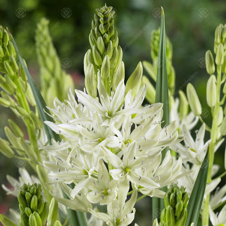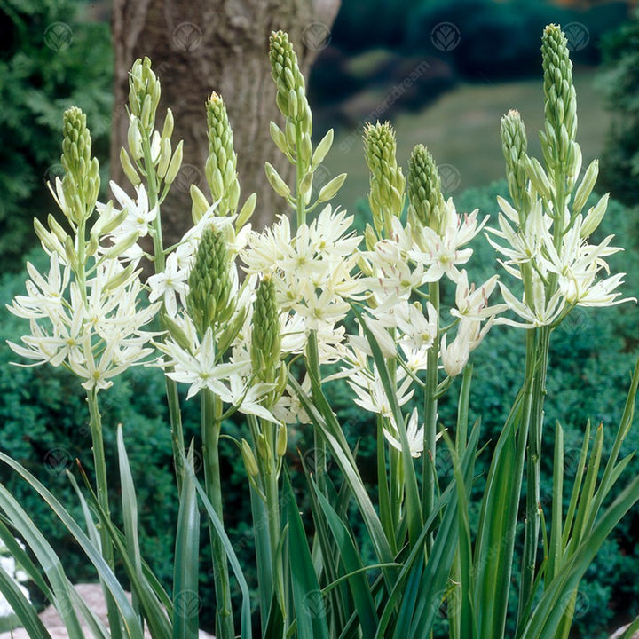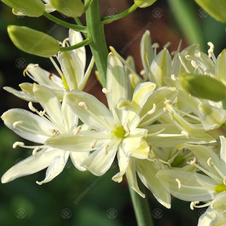Camassia Leichtlinii Alba produces large racemes on tall erect stems and from these form six-petalled, star-shaped creamy white petals with yellow anthers and pale green centres. Blooms open in a cascading effect starting from the lowermost portion of the buds and slowing moving upwards the highest blooms eventually revealing their stunning white stars