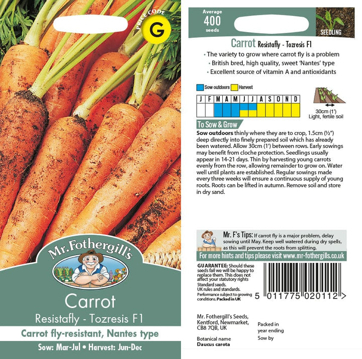 A British-bred variety with improved resistance to carrot fly. The medium-long, smooth Nantes type roots have superb colour, a small core and a sweet taste.