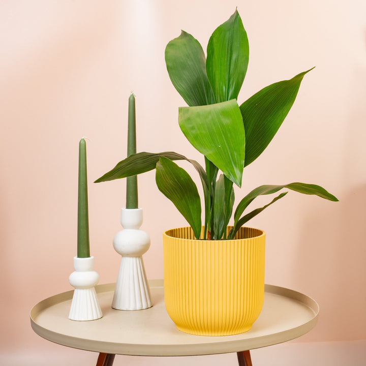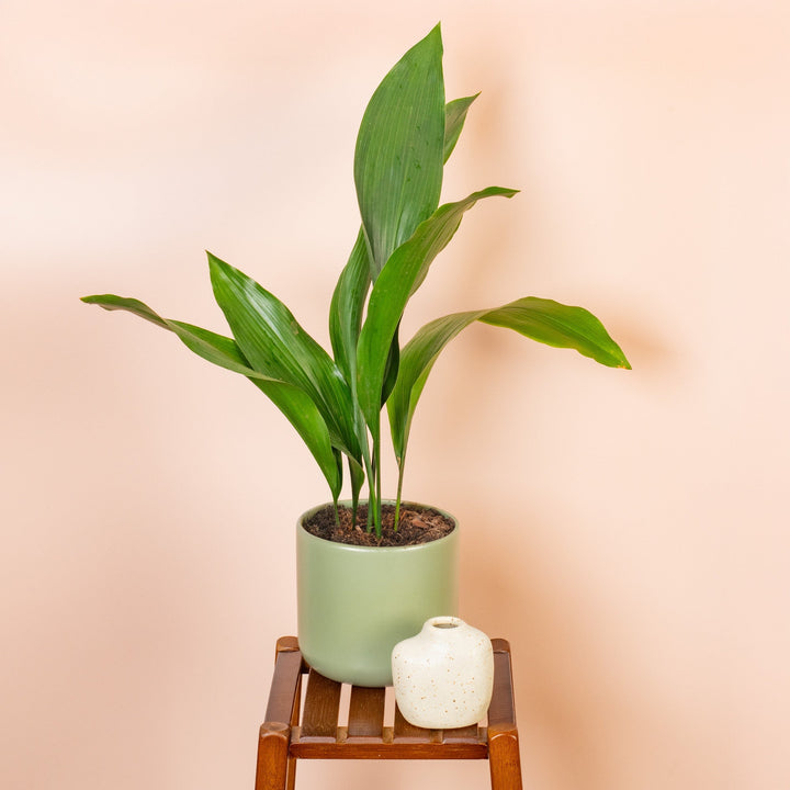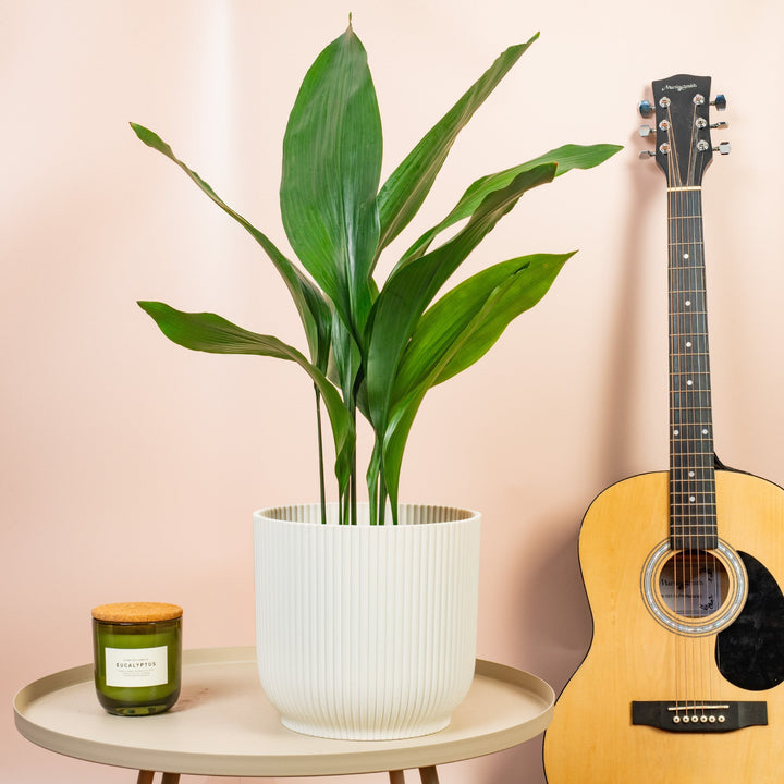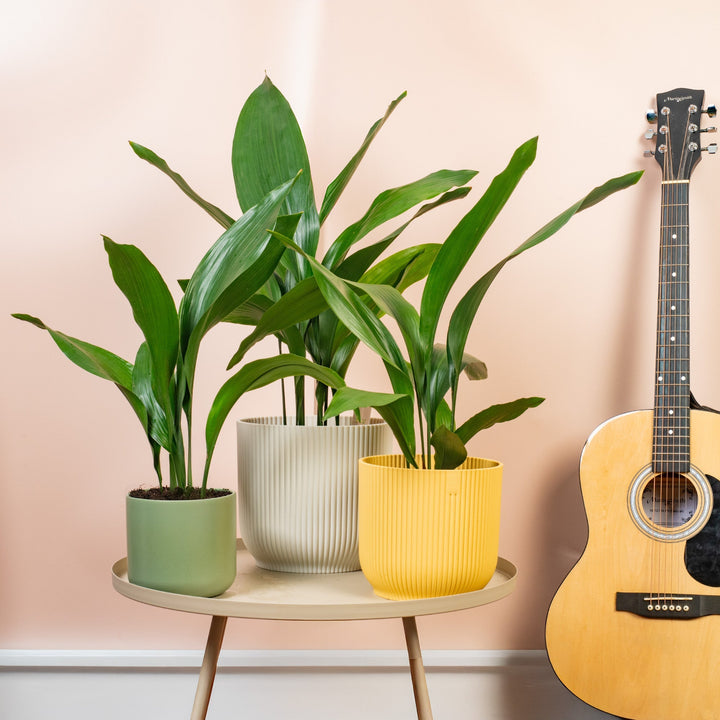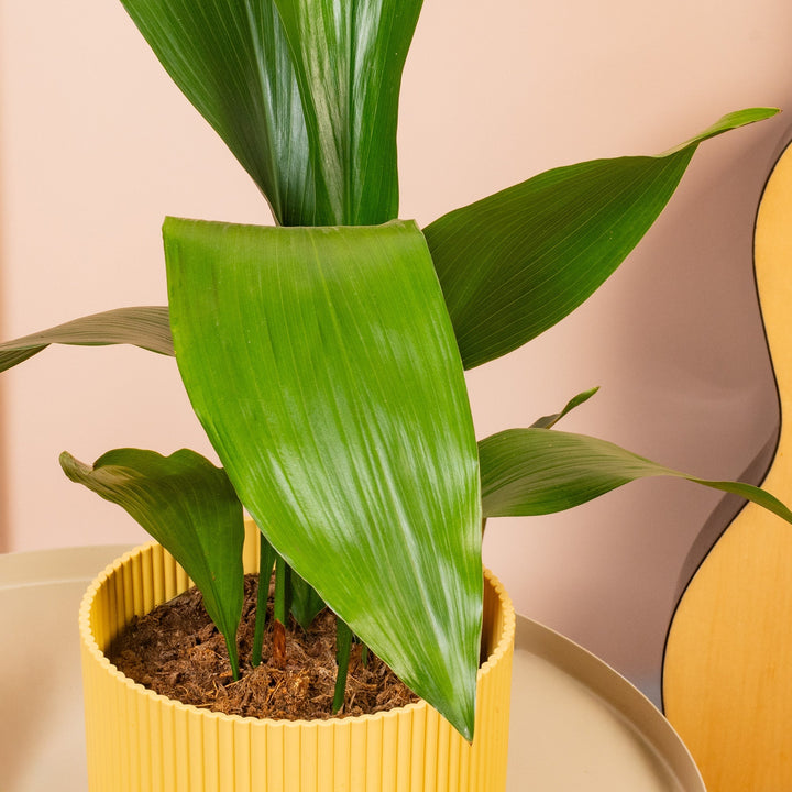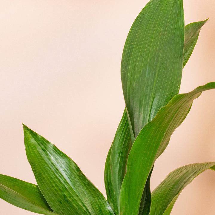 The cast iron plant, also known as Aspidistra elatior, is a hardy evergreen perennial native to East Asia. Its resilience and ability to thrive in low light conditions have earned it its name. With long, glossy dark green leaves that can reach up to 60cm in length and 12.5cm in width, this plant adds a touch of the tropical to any indoor space. The stiff, leathery leaves are arranged in a rosette pattern at the base of the plant, giving it a lush and luxurious appearance. Despite its tough appearance, the cast iron plant is low maintenance, making it an ideal choice for those who want to bring a bit of greenery into their homes or offices, but who may not have the time to dedicate to more demanding plants. Its ability to tolerate neglect and low humidity levels make it a popular choice for indoor spaces, particularly in areas with limited light. So, if you're looking for a beautiful and low maintenance plant to add to your home or office, the cast iron plant is a perfect choice.