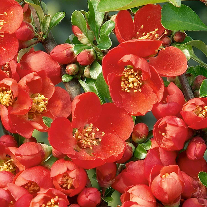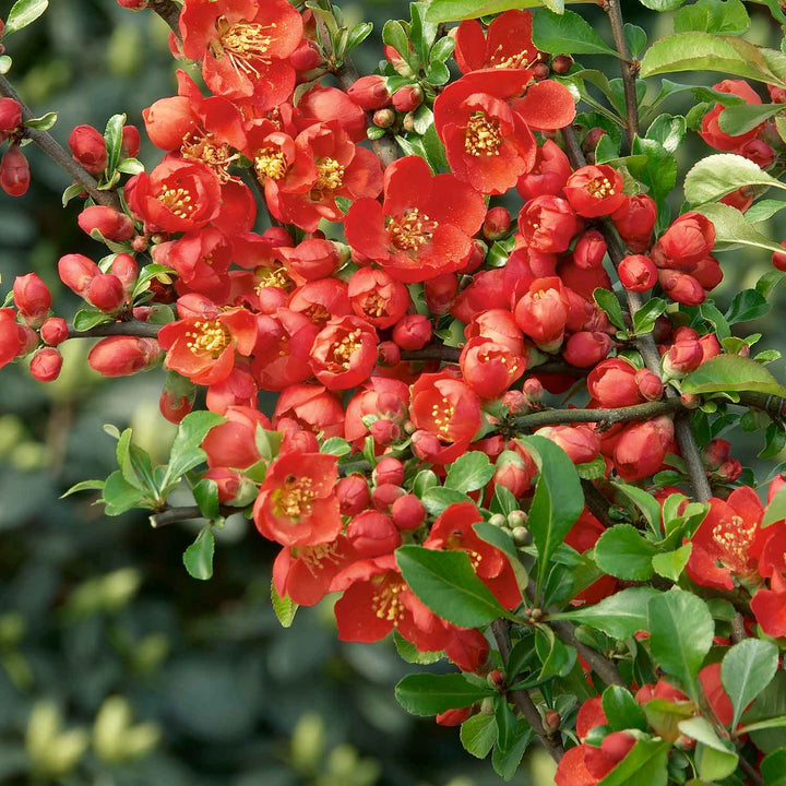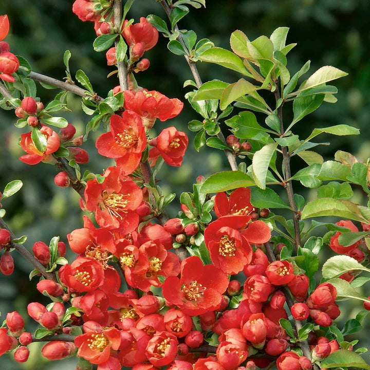 Chaenomeles, or ornamental quince, are spiny-stemmed deciduous shrubs with small serrated leaves. Their colourful flower clusters emerge just before the leaves and continue to bloom for several months from late winter until March and April followed in late summer by fragrant fruits which can be made into preserves or compotes. Chaenomeles sup. ‘Red Trail’ has cup-shaped bright red flowers centred with distinctive yellow anthers then, in late summer, speckled fruit.