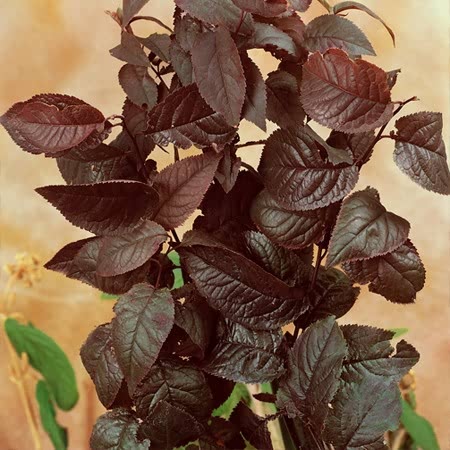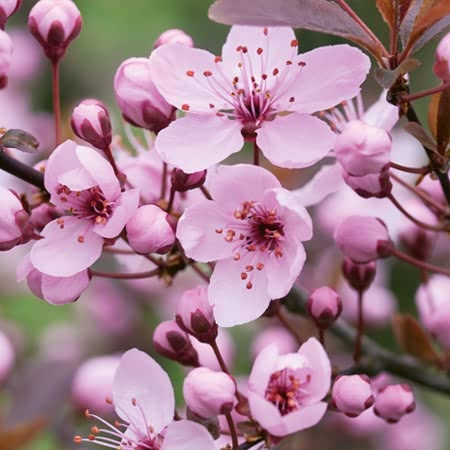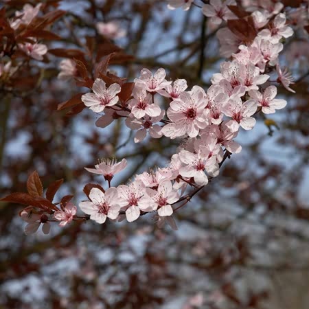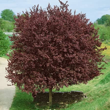 The 'Nigra' flowering cherry is a stunning, medium-sized deciduous tree with a round-headed form, known for its deep, rich purple leaves and early spring blooms. Single, pale pink flowers open from darker pink buds before the leaves emerge, creating a striking contrast and bringing colour to the garden early in the season. Even in winter, its silhouette adds interest to garden landscapes, whether formal or natural.