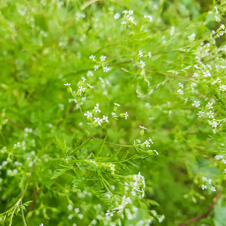 - Tiny white flowers appear amongst the feathery foliage in spring