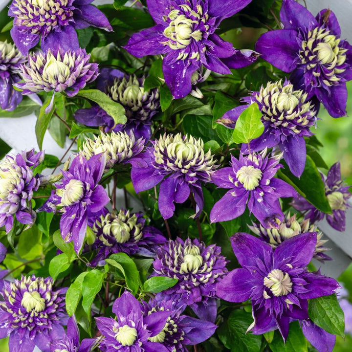 An extraordinary, stand out, double-flowered variety with stunning blue-purple flowers that are produced from late spring to autumn. The delicate flowers have the look of passion flowers, with tips of greenish white. Simply stunning! Height 2.4m (8').
