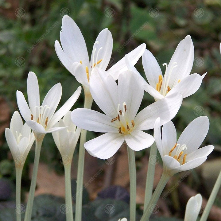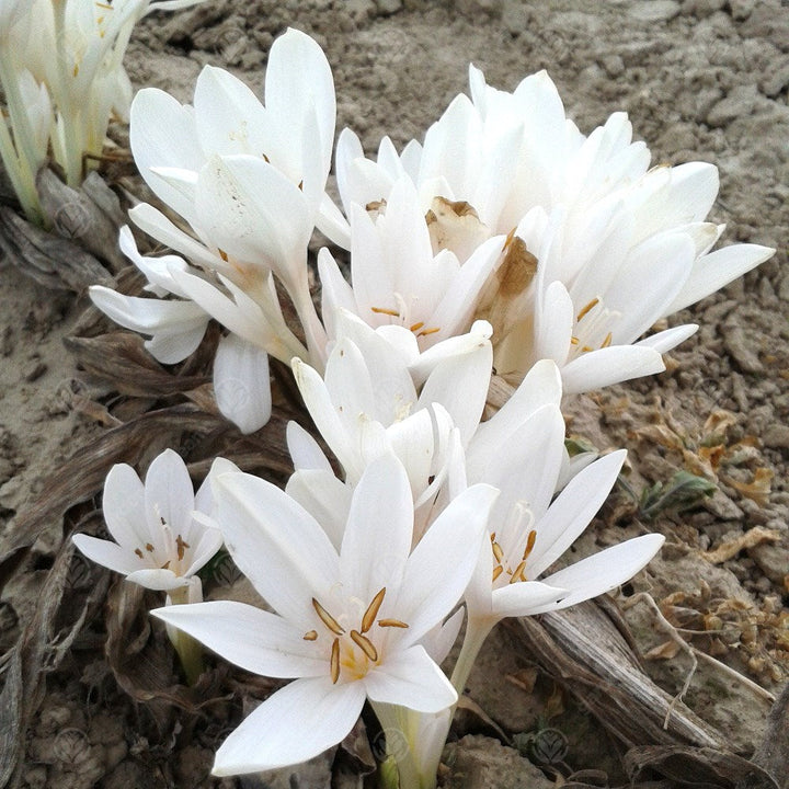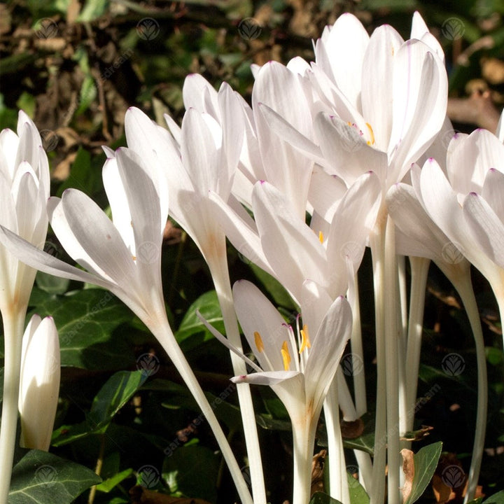 Colchicum Autumnale Album is autumn blooming flower with up to 30 flowerheads per corm or bulb-like root. Devoid of leaves during the flowering, elongated yellow-tinged white stems produce in large masses, cup-shaped, white-petalled flowers often with a slight pink hue towards the base.