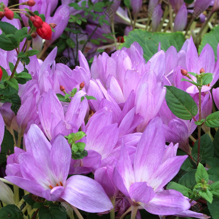 Colchicum The Giant produces multiple, large cup-shaped blooms on bare stems in the autumn. Brilliant lavender purplish-pinks develop from corms or bulb-like base roots. Devoid of foliage during the blooming season, broad green leaves can be seen in the springtime.