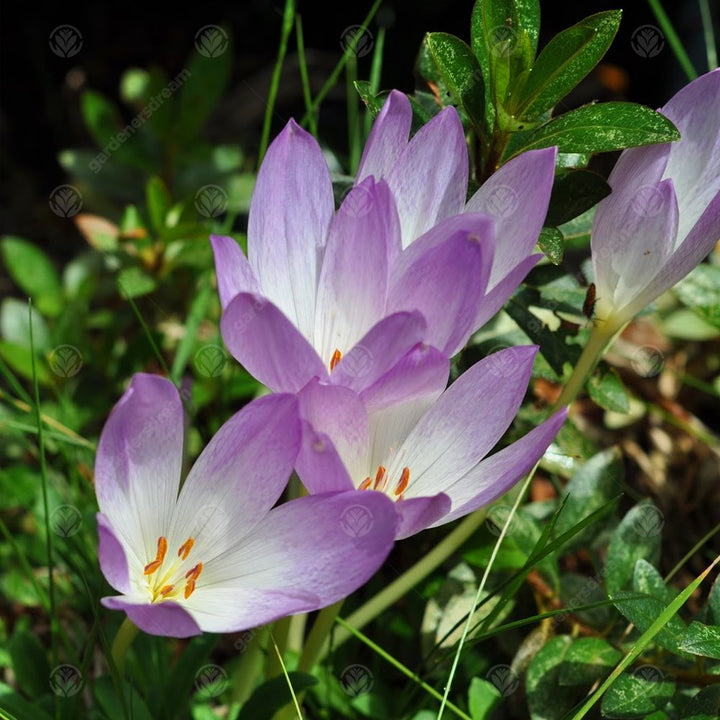 Deeper purple hues towards the tips of the petals, Colchicum The Giant is a treasured flowering plant of long-standing, an heirloom variety, and is one of the tallest Crocus. Left alone it will naturalise an area. Can be grow in pots and containers and does well growing in borders and beds under shrubs or trees. Inedible - Toxic if ingested.
