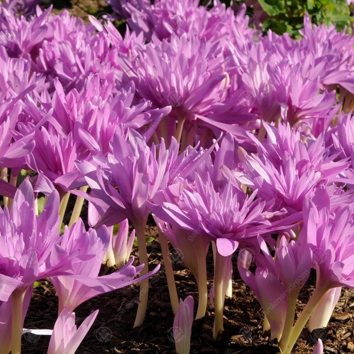 Colchicum Waterlily produces multiple, frilly double flowers of lilac-pink blooms are born on bare, pale green-grey stems in the autumn. Vibrant lilac-pinks to paler hues with blushes of white develop from corms or a bulb-like, base root. Devoid of foliage during the blooming season, strap-like green leaves can be seen in the springtime