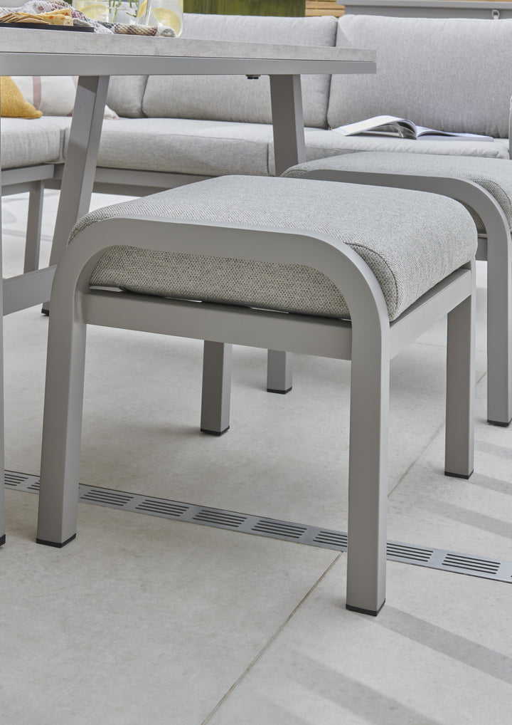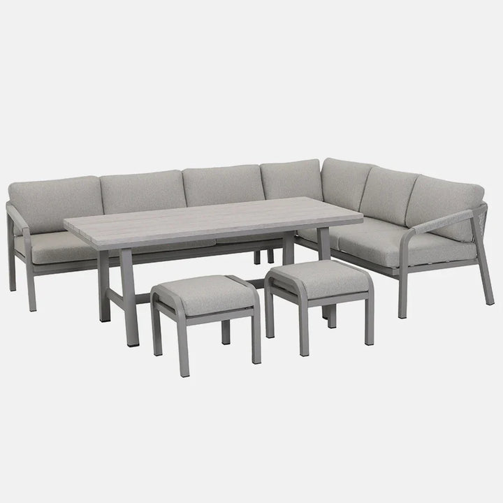 Introducing the Como Corner Lounge/Dining Set with Footstools, new for 2025. This stunning set brings both style and versatility to your outdoor space with its distinctive colourway and modern design. Featuring a spacious corner sofa with plush cushions, two footstools with matching cushions and a unique wood-effect slat top casual dining table, this set is perfect for both dining and lounging. The lightweight yet durable aluminium frame paired with a polyester rope back adds a contemporary touch to any garden or patio. Elevate your outdoor entertaining with the Como set and enjoy both comfort and style throughout the summer.