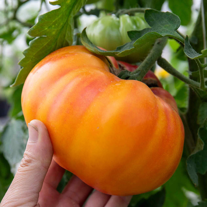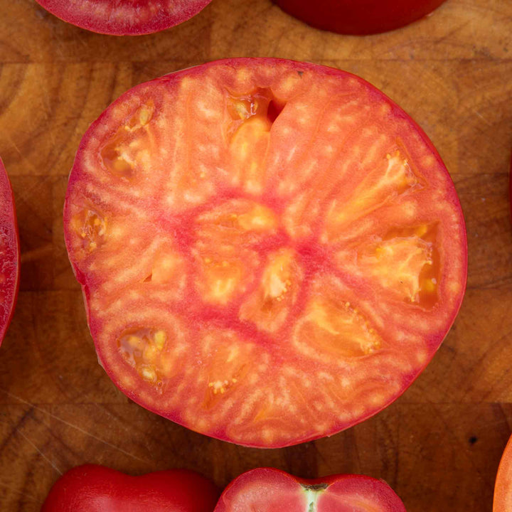Producing large fruit which are a stunning flame red and and orange colour, it's the perfect variety to brighten up growbags, containers and beds. A star performer in growing trials, this late-blight resistant, heritage variety has a sweet taste and minimal seeds inside making it great for cooking with. Thick full flesh with streaks of red and orange.