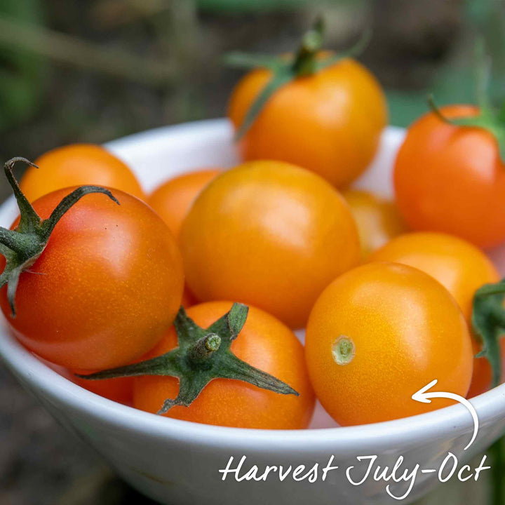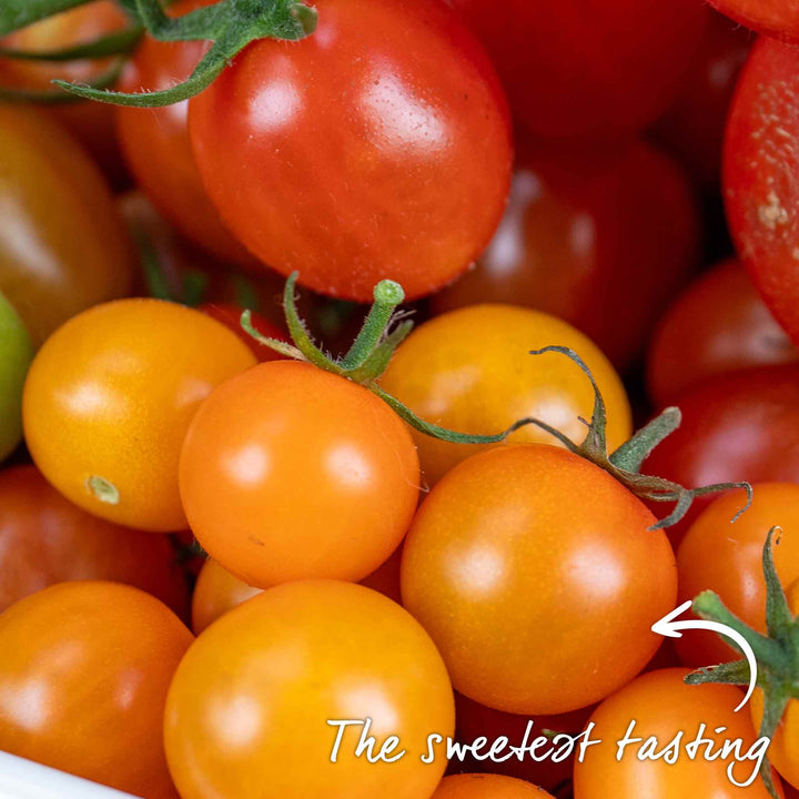 Sungold has a very high sugar content and thin skins making it one of our best selling tomatoes large numbers of bright orange tomatoes on each truss. A standard of sweetness by which all other tomatoes are judged buy. If you want to try just one variety of tomato, choose this one.