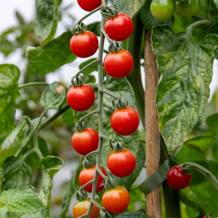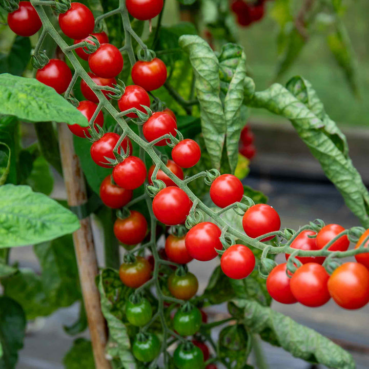 An easy-to-grow cherry tomato that will give best results grown in a greenhouse. Its F1-hybrid status means every plant is naturally vigorous and free-fruiting giving you a huge crop of sweet cherry tomatoes, rich red in colour. Every fruit weighs 15-22g and an average truss gives around 15 tomatoes. Good resistant to fusarium and leaf mould.