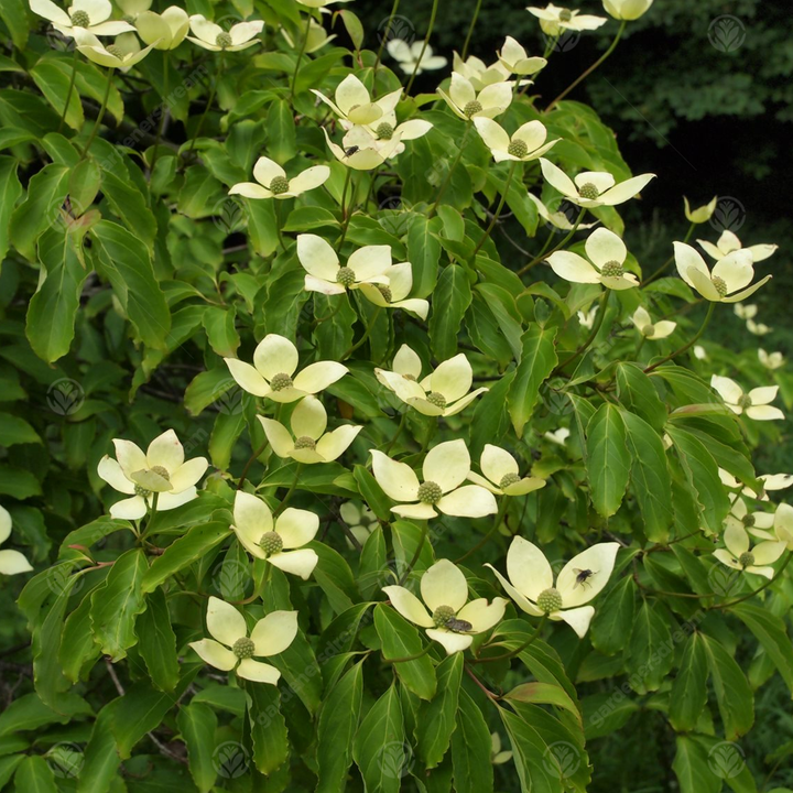 Cornus 'Gloria Birkett' is a species of Flowering Dogwood well known for their ease of care and low maintenance. The foliage appears a mid-green when young, later turning to red and purple as Autumn approaches. Tiny green flowers appear in a tight cluster and are surrounded by large white bracts that, just like the foliage, gain a shade of pink and then red as they age and later give way to small, berries in the Autumn.