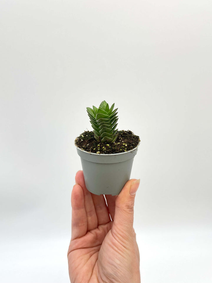 Look no further than Crassula Buddha’s Temple for a unique and eye-catching addition to your plant collection. With its upward-facing leaves resembling the grandeur of a Chinese temple, this plant is sure to make a statement in any room. During the summer months, a mature plant may even produce charming pink flowers. Despite its distinctive appearance, this cute little guy won't take up much space and can fit into any corner of your home. Crassula Buddha’s Temple is a low-maintenance plant that stays small, making it perfect for any indoor space.You can also consider planting it in a terrarium, where it can become a feature piece within your space