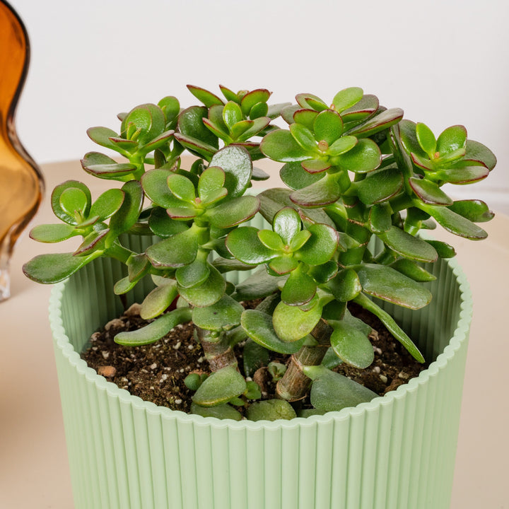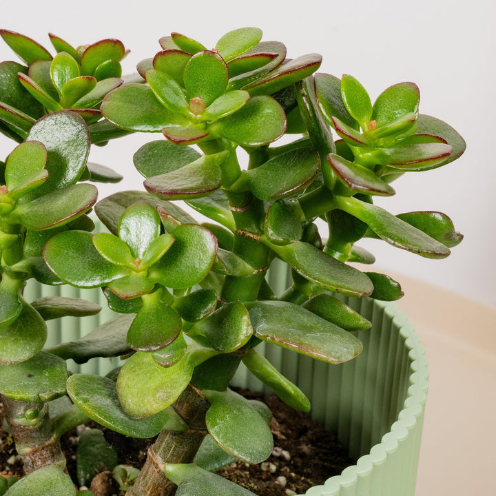 Crassula Ovata, also known as the Jade Plant or Friendship Tree, is a unique, bushy succulent with fleshy, rounded green leaves. It'll release clusters of small white blooms in the summer.