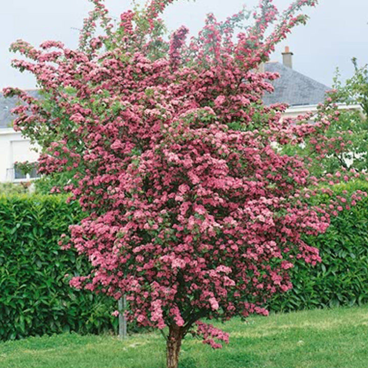 The Crataegus Paul's Scarlet is also known as the Midland Hawthorn tree. This delightful tree has an RHS Award of Garden Merit. It offers a fairly compact shape with masses of beautiful deep scarlet-pink double flowers which appear in spring, from March to May. The flowers are beautifully contrasted by a luscious green foliage of slightly glossy, dark-green, deeply lobed leaves. In autumn it looks glorious with red fruits, known as haws. Adding to the spectacular display in autumn, are the leaves which turn to vibrant shades of orange and yellow before falling. In winter, it looks stark and the thorns on the branches can be seen.