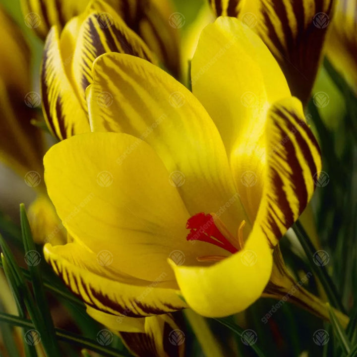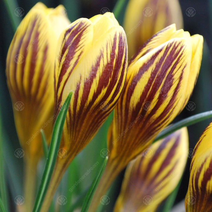Scented early spring blooms, dwarf Gipsy Girl is a botanical Crocus that heralds the coming spring with delightfully bright yellows and plum feathering. Plant together for groups of lively golden blooms in beds, borders, edging, rockeries or use in pots and containers for accenting walkways patio areas or window sills. Great for naturalising lawns, under shrubs and trees
