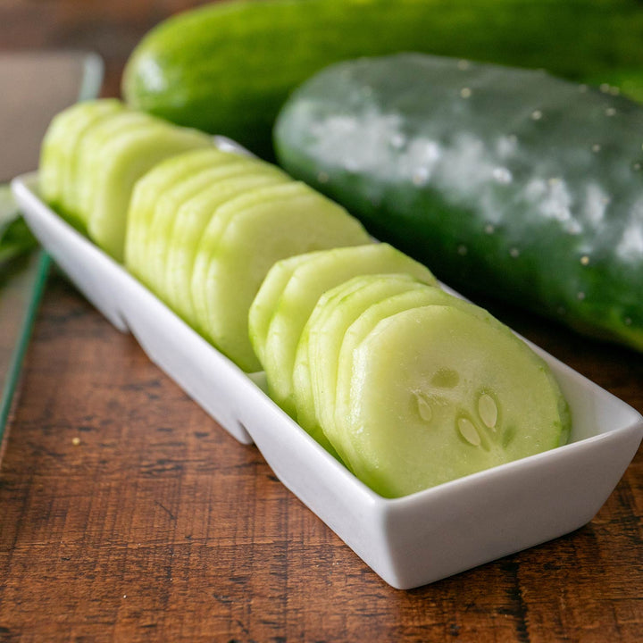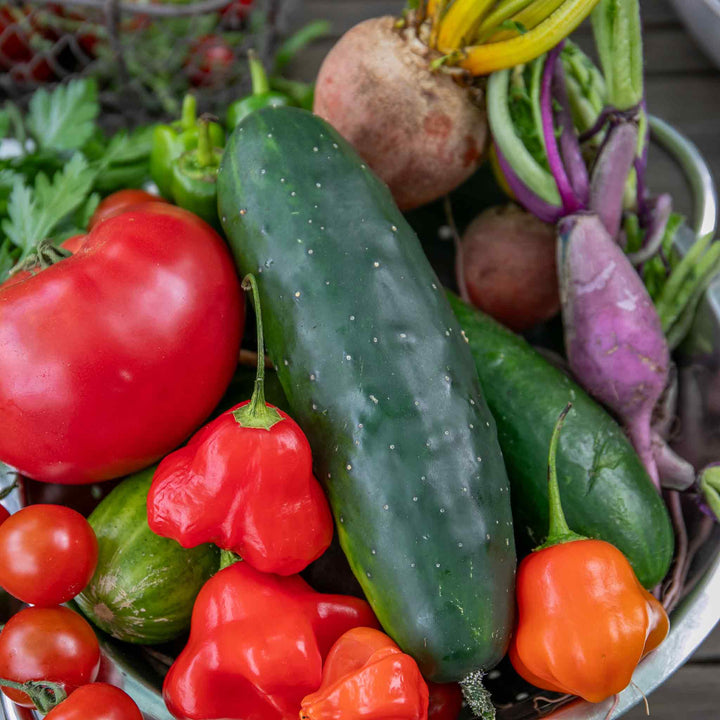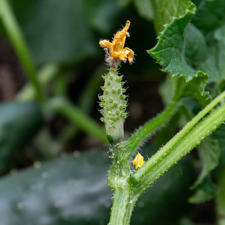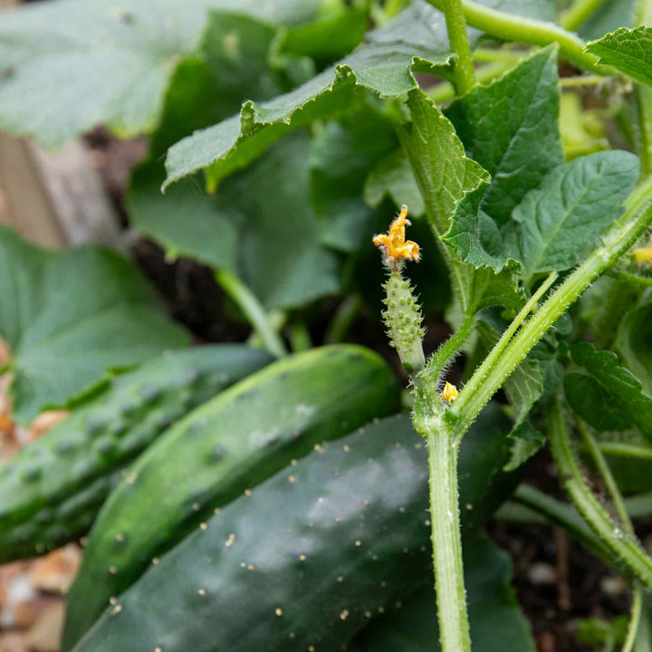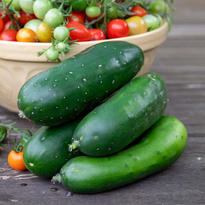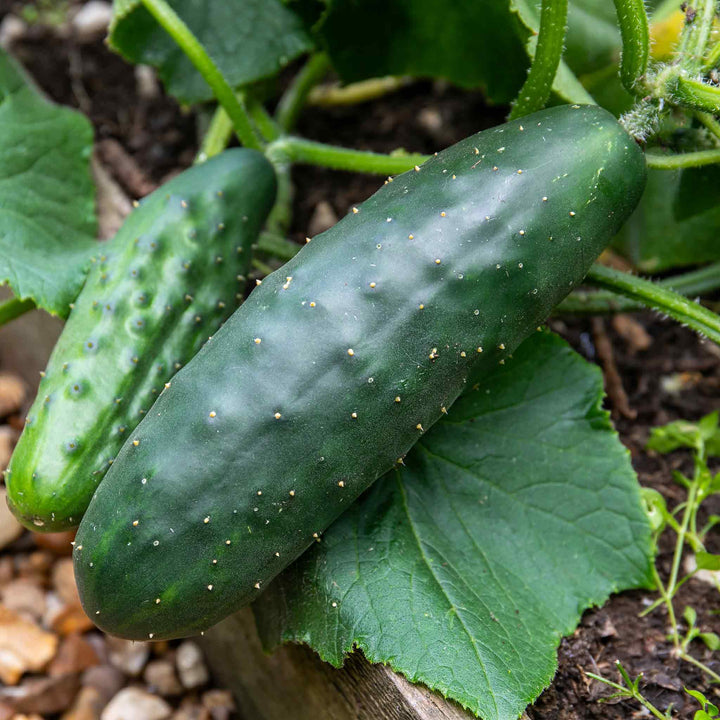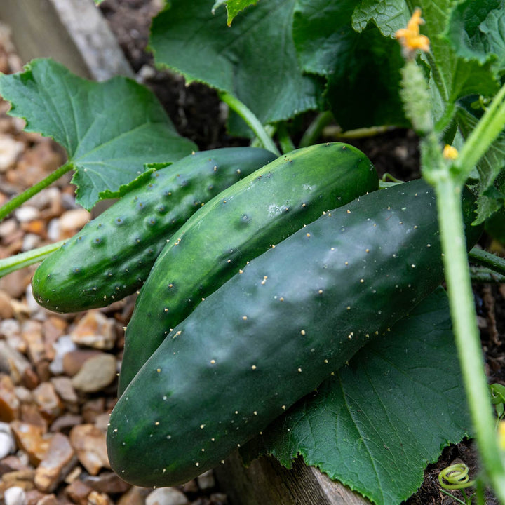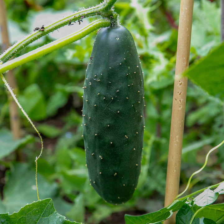 Cucumber 'Marketmore' is an excellent performer, producing a good crop of crisp, tasty cucumbers no matter what the summer weather does. The fruits are delicious picked young for snacking or left to mature into large cucumbers. This reliable variety holds the RHS Award of Garden Merit.